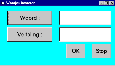 Zet er 2 labels met als opschrift Woord: en Vertaling: en 2 buttons met als opschrift OK en Stop