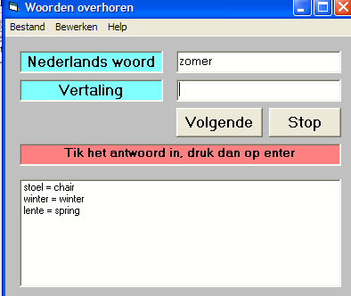 We gaan het programma uit paragraaf 6 (het woordjes-overhoor programma) zo aanpassen dat er een echt Windows-menu wordt gebruikt.